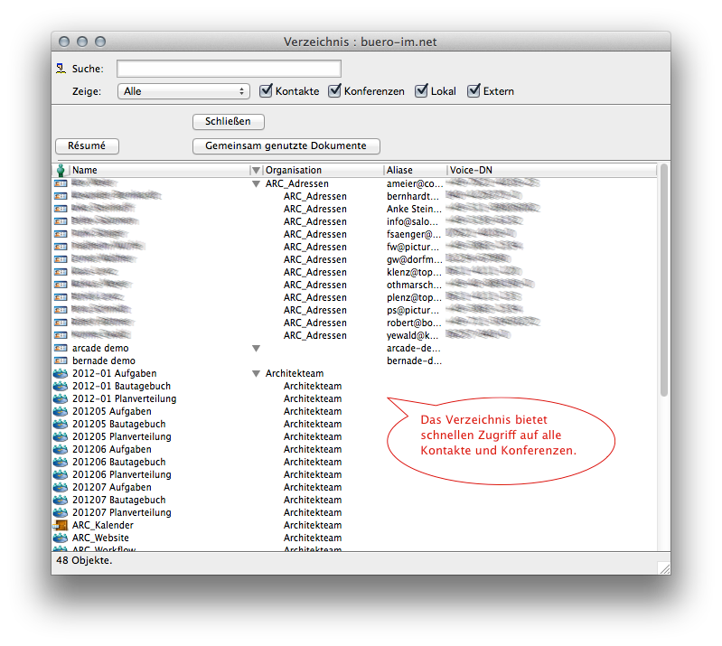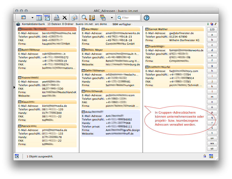 Neben Ihrem persönlichen Adressbuch können Sie in buero-im.net beliebig viele weitere Adressbücher für Ihre gesamte Firma, für Ihr Team oder für Ihr jeweiliges Projekt anlegen.